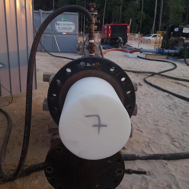 Testes de estanqueidade e resistência mecânica em tubulações, válvulas e spool conforme normas NBR e ASME.