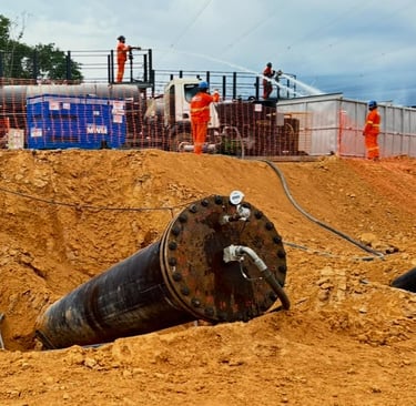 Durante o processo, o duto é preenchido com líquido adequado, submetido a uma pressão superior à de operação e mantido sob essa condição por tempo controlado. Esse método permite identificar vazamentos, deformações e falhas estruturais, garantindo a confiabilidade do sistema.